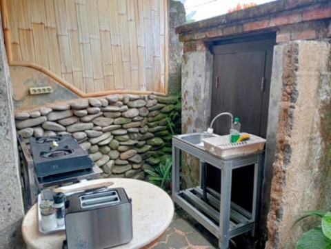 A mineral water dispenser, a 50 L fridge, a double gas burner and a sink set on the private terrace.