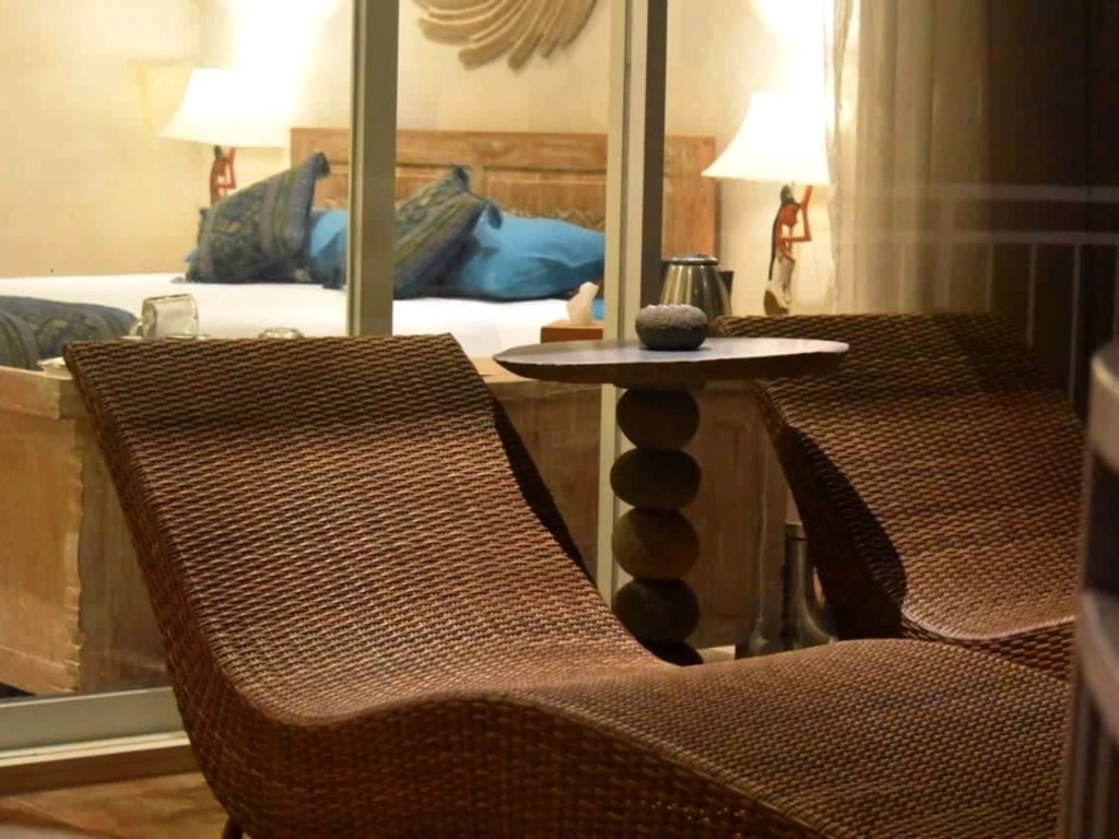Deux chaises et une petite table sont disposées devant la chambre sur le balcon.