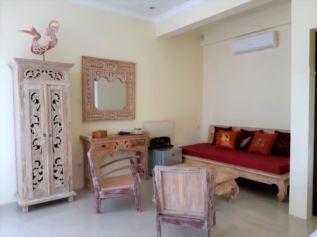 La suite comprend une petite armoire et une étagère, l’air conditionné, un coffre-fort, deux réfrigérateurs de 50 L, deux bouilloires et un sèche-cheveux.
